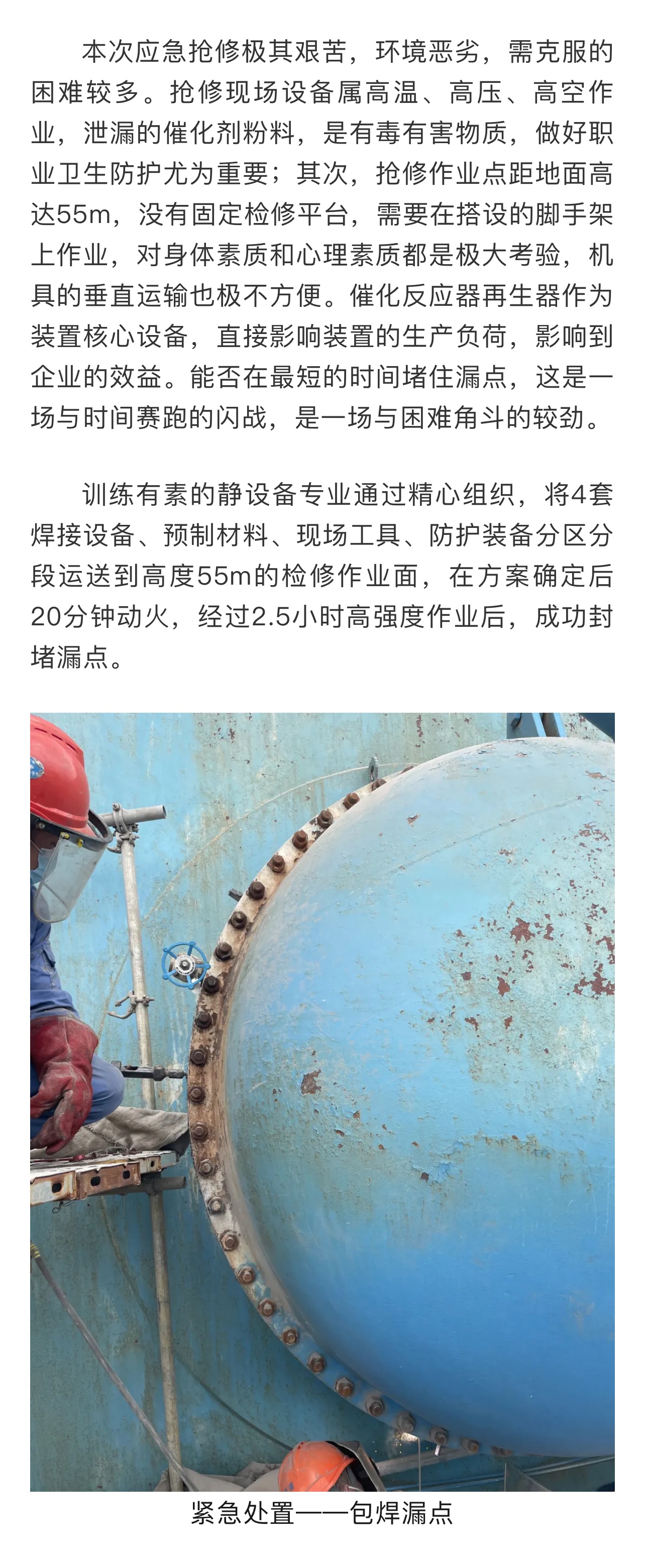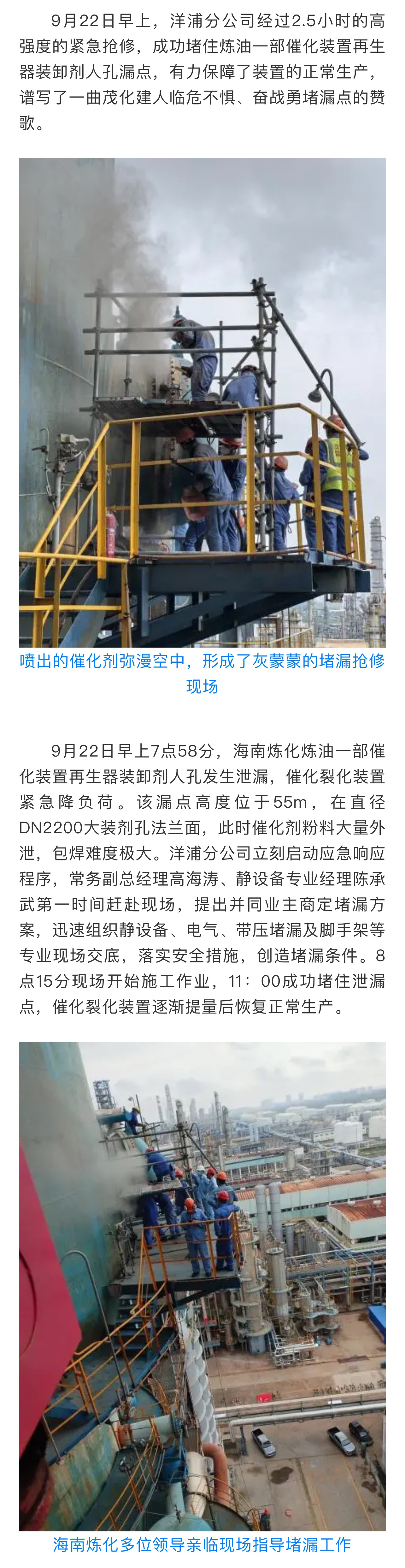 洋浦分公司高強度作業(yè)2.5小時,成功堵住再生器漏點