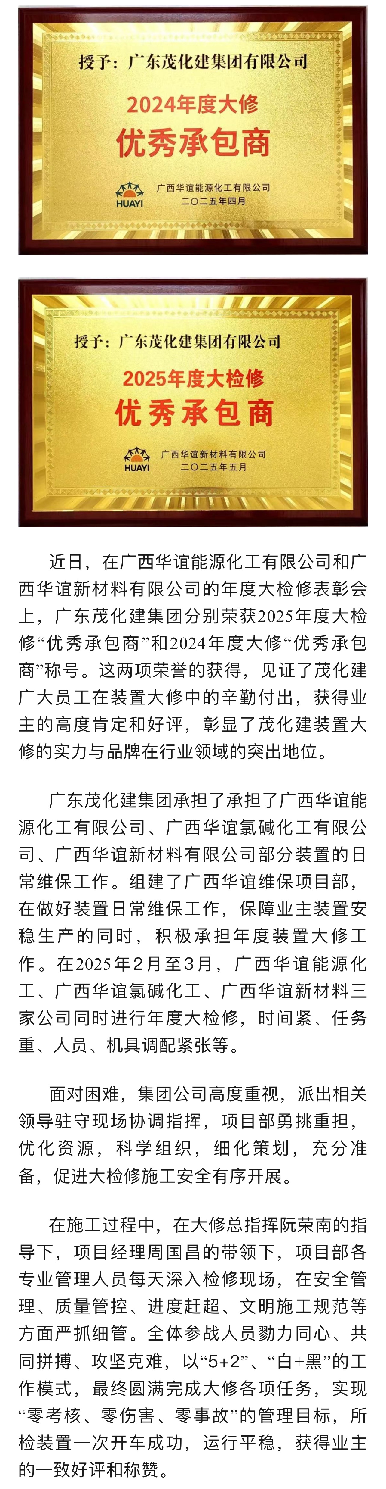 雙喜臨門(mén)|茂化建榮獲廣西華誼能源化工、新材料大修優(yōu)秀承包商稱號(hào)